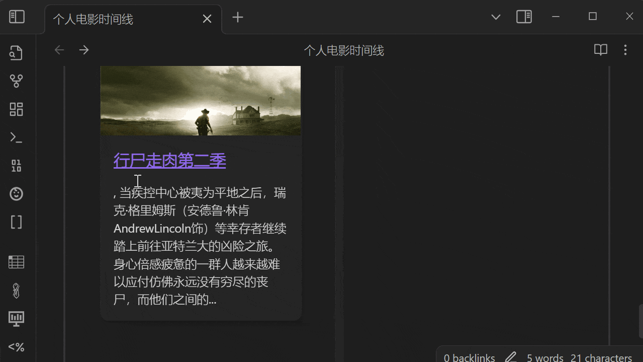 - 配置同步需要的模板 电影/书籍的模板中的frontmatter,在frontmatter中 增加 特定tags(根据自己的需要指定),用于需要过滤成为timeline的笔记,如增加tags: